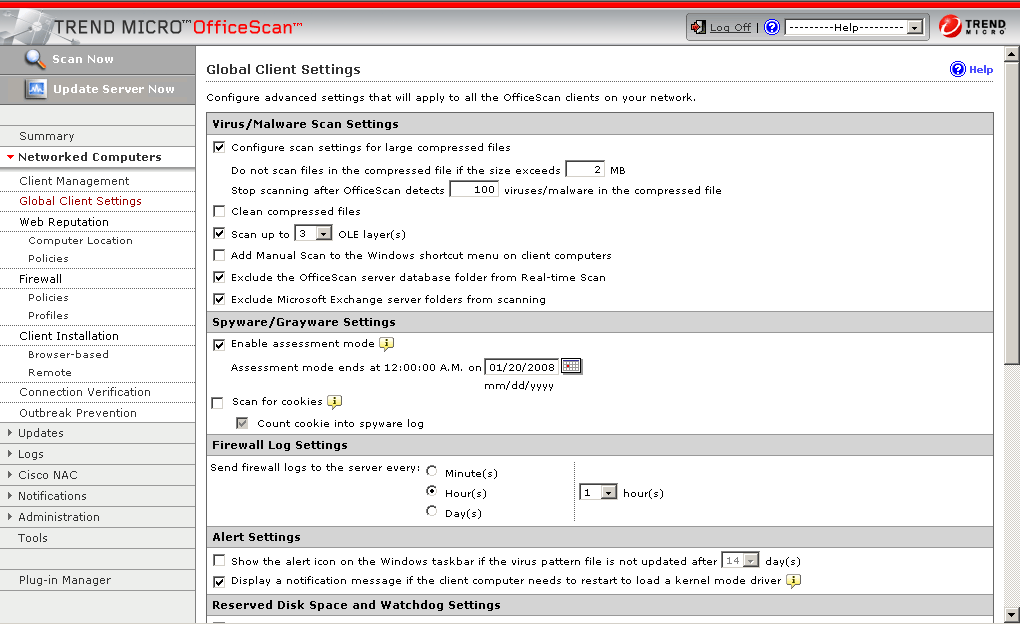 Настройки, перечисленные на этом экране, действуют для всех клиентов OfficeScan. Здесь указываются параметры антивирусного сканирования (проверка архивов, их очистка, ограничение уровня вложенности проверяемых архивов, исключение из мониторинга каталогов с базами OfficeScan и Microsoft Exchange Server), параметры поиска spyware и grayware, периодичность отправки клиентами на сервер OfficeScan журналов работы файрвола, настройки всплывающих сообщений на компьютерах пользователей (о необходимости перезагрузки после установки или обновления клиентской части для запуска драйвера OfficeScan, работающего в режиме ядра, и о критическом устаревании баз описаний вирусов). Здесь же настраивается автоматическая проверка работоспособности клиентской части и её перезапуск при необходимости, резервируется место на диске для получения и распаковки обновлений, и так далее. В этом же окне можно выбрать способ группировки клиентов OfficeScan: по домену NetBIOS, по домену Active Directory или по домену DNS.
