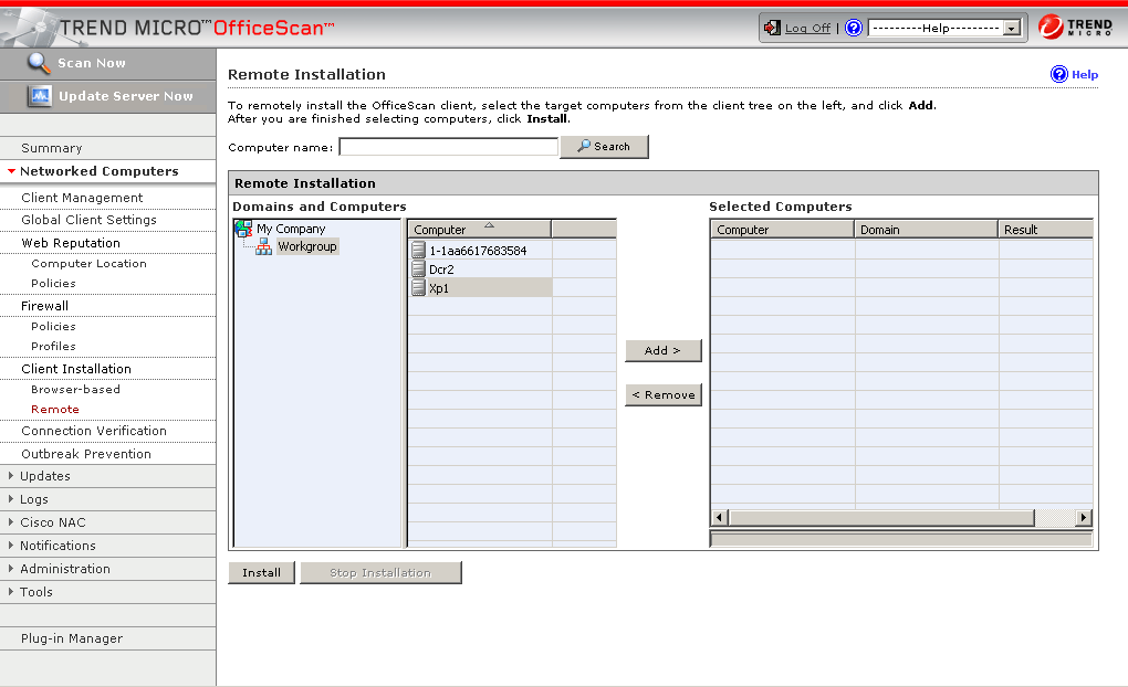 Щелкните чтобы увеличитьВ левом списке будут выведены все компьютеры локальной сети. Их можно при помощи соответствующей кнопки добавить в список справа и после нажатия кнопки «Install» на эти компьютеры будет установлен клиент OfficeScan. Если компьютер, на который необходимо установить клиентскую часть, не введён в домен (или домена нет), то при попытке добавить такой компьютер в список справа сначала будет выдан запрос логина и пароля. Если установщику удастся авторизоваться на выбранном компьютере, то машина будет добавлена в список для последующей удалённой установки клиентской части OfficeScan. Поскольку для установки клиентов требуется учетная запись с правами администратора, то следует вводить реквизиты именно такой записи. Пожалуй, единственный минус данного способа установки заключается в том, что в списке слева никак не выделены компьютеры, на которые уже установлен клиент OfficeScan. Хотя после запуска установщик проверяет наличие установленного на удаленном компьютере клиента OfficeScan и если находит его, то прекращает установку с соответствующим сообщением об ошибке. Еще одна особенность этого типа установки заключается в необходимости предварительного отключения «Простого общего доступа к файлам». Если этого не сделать, компьютер в список для установки добавить не получится.