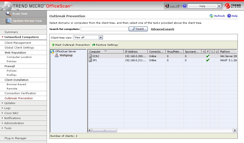При возникновении в локальной сети внештатной ситуации, когда какой-либо из клиентских компьютеров заразился новой разновидностью вируса и есть угроза начала эпидемии в локальной сети, администратор может использовать инструмент «Outbreak Prevention» для быстрого ограничения или запрета доступа к общим ресурсам, а также к определённым портам.