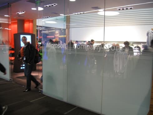 В нем на полочках и вешалках расположились фирменные товары — от рубашек, джемперов, блузок для взрослых и подростков до флисовых шапочек и нагрудничков для младенцев; ручки, кружки, зонтики, сумки, блокноты и пр., а также различная компьютерная мелочь: считыватели флеш-карт, разветвители USB, коврики. И на каждом предмете логотип либо самой Microsoft, либо одного из ее продуктов. В дальнем углу за стеклянными дверями громоздятся коробки ПО, упаковки XBox и другие «железные» товары (естественно, тоже производства Microsoft), но обычному посетителю туда хода нет, за двери пропускают только сотрудников компании и счастливых обладателей ВИП-сертификатов. Все же прочие товары можно покупать хоть пачками.