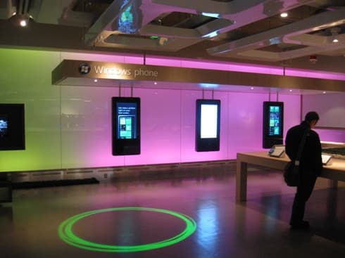 Чуть дальше — столы с коммуникаторами с Windows Phone 7 и их увеличенные макеты.