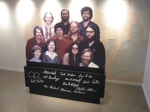 Рядом расположился коллаж из картонных фигур, изображающих первых сотрудников компании (с их автографами).
