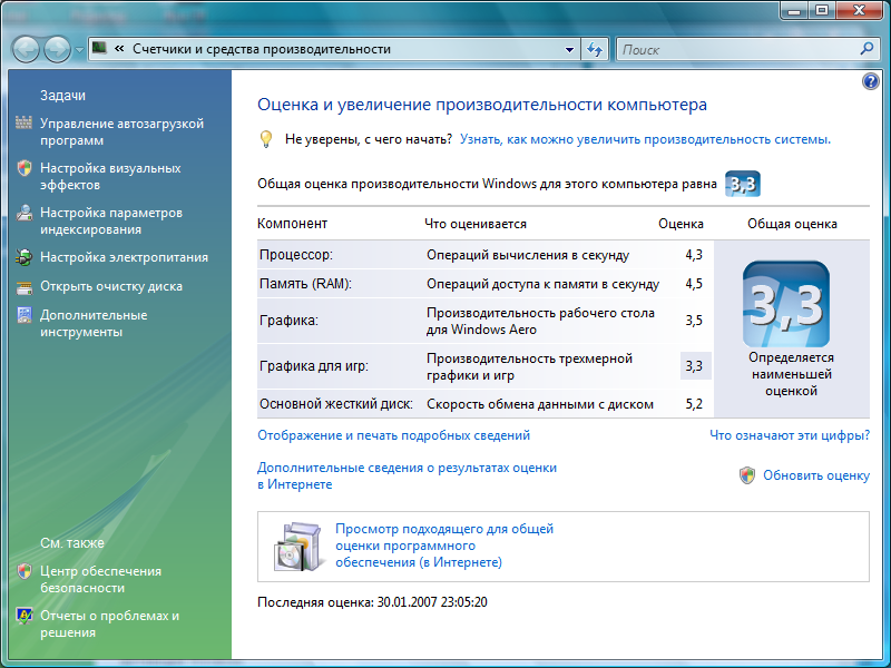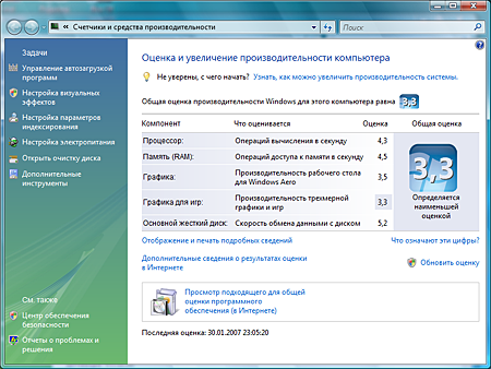 Раньше при выборе программ (особенно игр) приходилось тщательно изучать их системные требования и сравнивать их с характеристиками компьютера. Иначе был риск потратить деньги на то, что окажется невозможным использовать. Если для технически подкованных пользователей это было не слишком сложной задачей, то для людей, покупающих «пентиум и жифорс», выбор становился делом не совсем тривиальным. Windows Vista предоставляет новый способ решения этой задачи. Она вычисляет рейтинг компьютера.