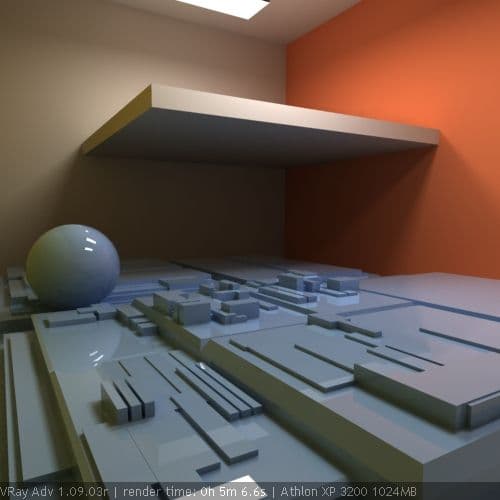 Собственно расчет освещенности точек выполняется аналогично direct computation - сэмплируется полусфера, находятся точки пересечения, рассчитывается прямая освещенность, если для вторичных отскоков используется тоже direct computation - строятся новые полусферы, если фотонные карты - происходит оценка освещенности по плотности фотонов. В общем - как обычно :). Но еще одна важная особенность расчета irradiance map и first diffuse bounce в целом - то, что на этапе вычислений первого диффузного отскока происходит подключение (читай - смешивания, сложения) как прямого освещения, так и освещения secondary bounces. Такова особенность VRay. Он не хранит все компоненты освещенности по отдельности, расчет первого отскока выполняется с учетом прямого освещения и остальных переотражений и результат записывается в файл. И если прямое освещение все же не хранится самой irradiance map, его можно отключать/включать, то многократные переотражения после расчета самостоятельного значения уже не имеют. То есть, если рассчитанная с учетом фотонной карты irradiance map сохранена в файле для дальнейшего использования, то загрузку фотонной карты из файла как и расчет secondary bounces можно отключать и это никак не скажется на конечном результате. Другой пример. Рассчитаем irradiance map без secondary bounces и сохраним в файл. Рассчитаем фотонную карту и тоже запишем в файл. Если теперь при рендере для first diffuse bounce использовать irradiance map из файла, а для secondary bounces - записанную фотонную карту и посчитать освещение, то сложения освещенностей не произойдет. Мы увидим только irradiance map и прямое освещение. Эта особенность расчетов GI в VRay имеет и положительные стороны - размер irradiance map гораздо меньше размера фотонной карты. А вышеописанная особенность позволяет нам использовать только irradiance map для дальнейших расчетов, если она предварительно рассчитана с учетом фотонной карты, и забыть о многомегабайтной фотонной карте.