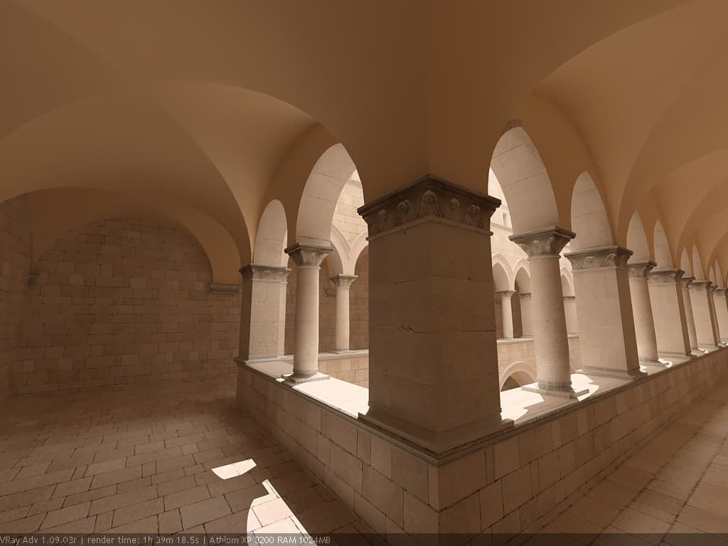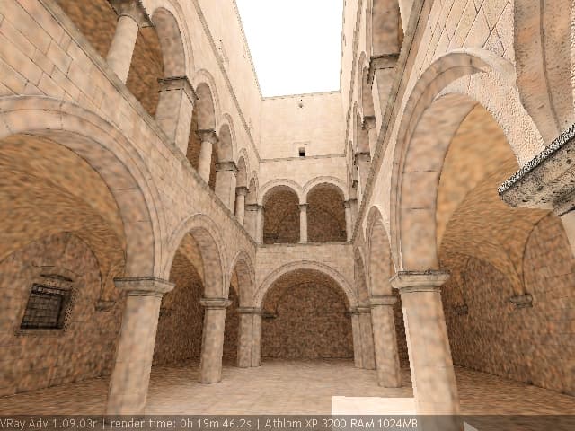 Для настройки я выбрал сцену, которую можно найти в Интернете по адресу http://hdri.cgtechniques.com/~sponza/files. Выбор именно этой сцены обусловлен тремя причинами. Во-первых, сцена специально предназначена для тестирования возможностей различных рендер-программ и представлена во всех основных 3d-форматах. На том же сайте отображена обширная галерея уже выполненных рендеров этой сцены, так что есть возможность сравнить свой результат с достижениями других. Во-вторых, сцена являет собой некий промежуточный вариант - это не совсем интерьер, так же как и не полноценный экстерьер. Это внутренний дворик, наглухо ограниченный четырьмя стенами. Свет внутрь проникает сверху через довольно глубокий колодец, образованный стенами дома. В сцене есть второй этаж и область под балконами, и доступ прямому свету туда затруднен. В-третьих, сцена довольно велика - около 40 метров по длинной стороне. Оригинальная сцена создавалась в LightWave. На сайте есть ее версия, адаптированная под 3ds max с материалами, с ней и будем работать. Вот как это выглядит в scan-line рендере 3ds max: