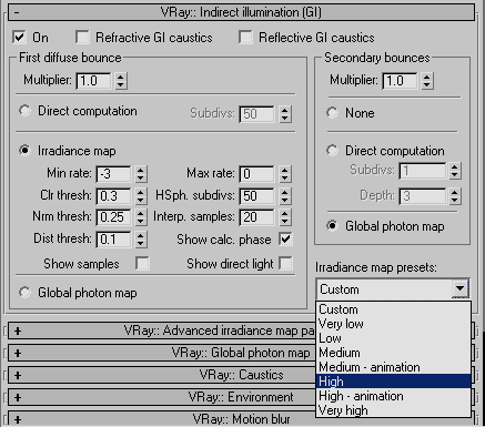 Снова переходим на закладку VRay: Indirect illumination и в качестве метода расчета первого диффузного отскока выбираем irradiance map. Для настроек irradiance map я выбрал Irradiance map preset>High, затем там же - Custom. Это позволяет редактировать настройки High.