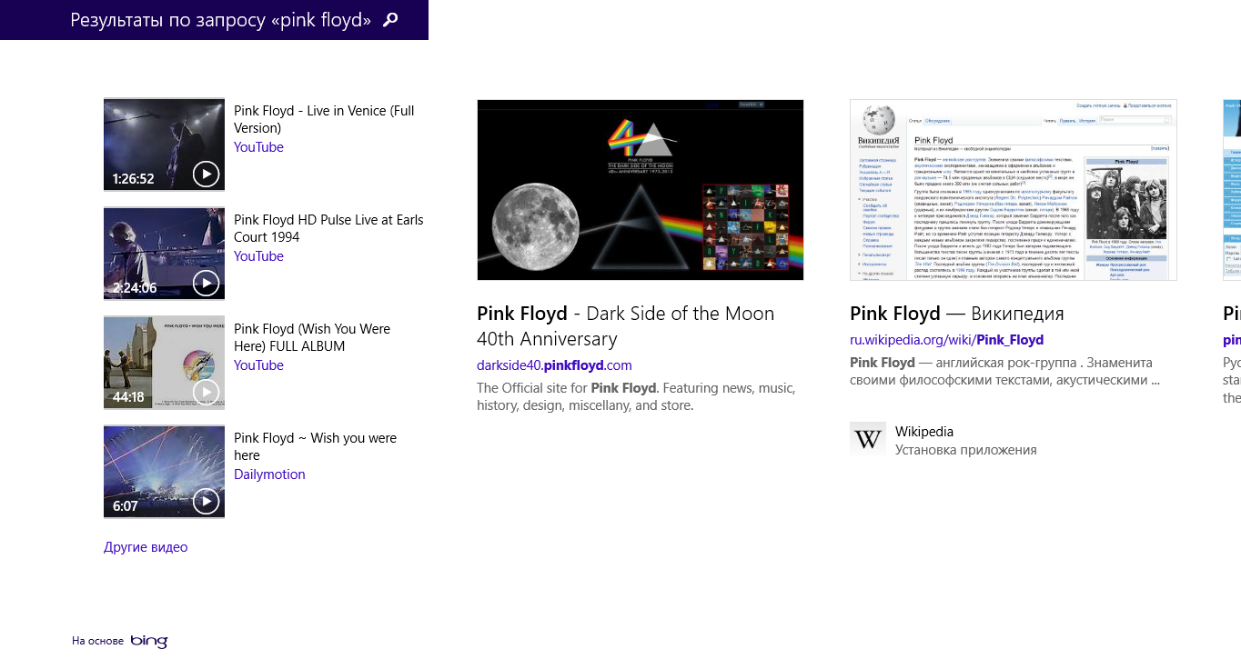Результаты поиска представляются «бесконечной» горизонтальной лентой с довольно удобной группировкой. Поскольку поисковые инструменты присутствуют в большинстве стандартных Metro-приложений, последние могут отображаться в результатах в виде соответствующих значков — щелчок на них открывает приложение сразу с информацией, соответствующей запросу. К примеру, Магазин по запросу «Pink Floyd» выдал несколько апплетов, начиная с информера о деятельности легендарной группы.