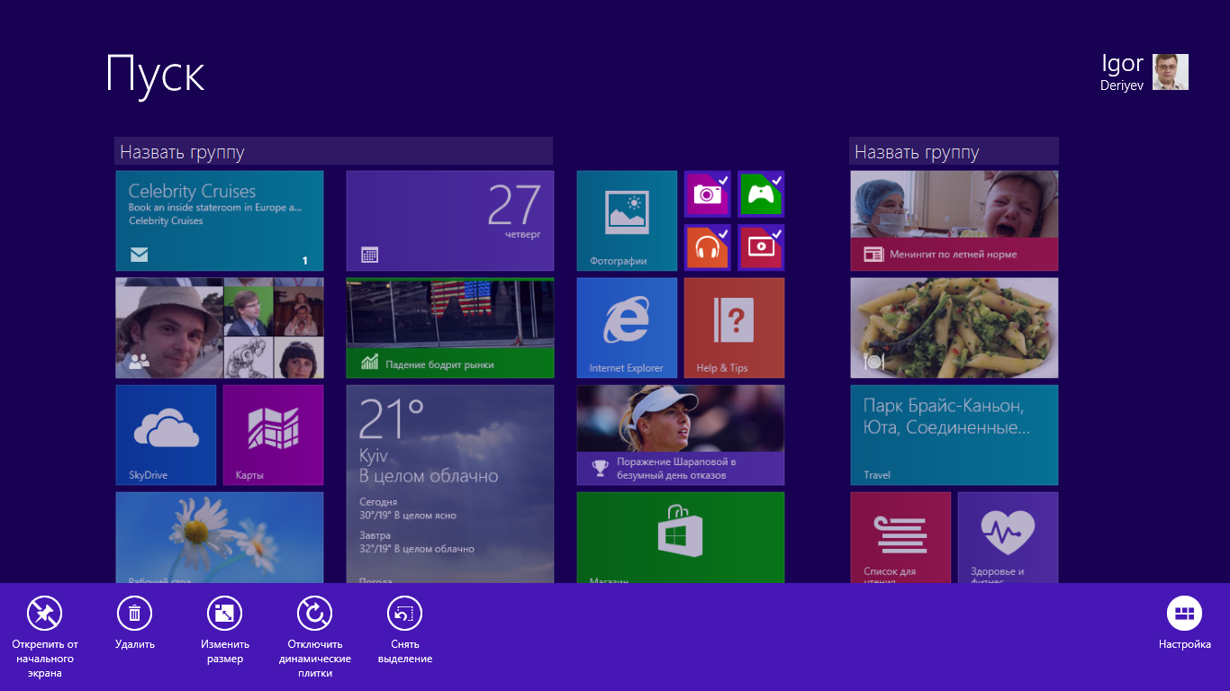 В параметрах (правая всплывающая панель «чудо-кнопок») появился раздел персонализации, где можно менять цветовую гамму и обои стартового экрана — ранее для этого выполнялось переключение на рабочий стол: