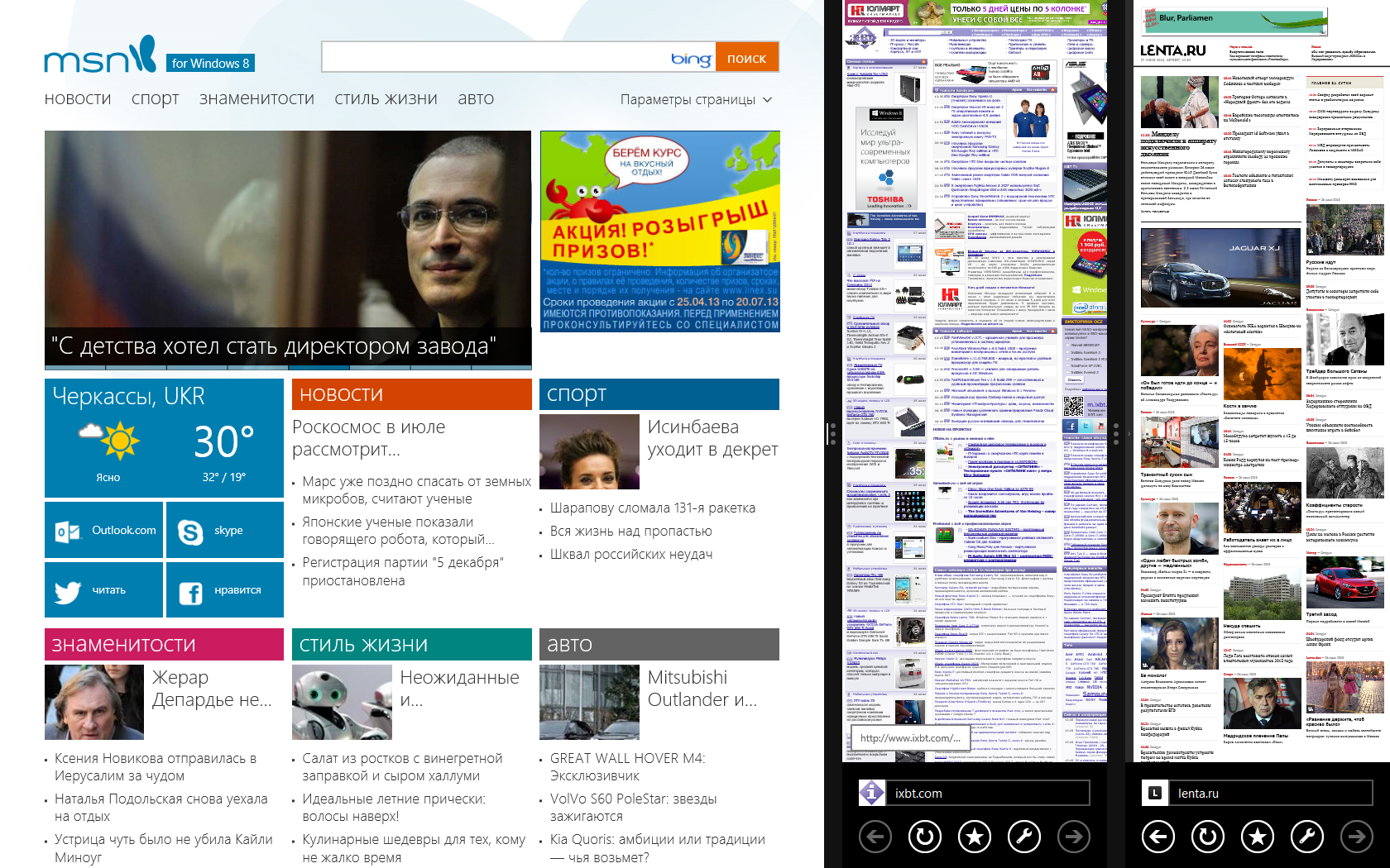Естественно, как и в оригинальной Windows 8, удобство работы с «ужатыми» приложениями сильно зависит от того, насколько корректно и интеллектуально они реагируют на такую ситуацию. К примеру, в Metro-варианте Internet Explorer 11 появилась возможность параллельного отображения нескольких страниц-вкладок: