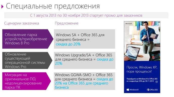 Воспользовавшиеся программой апгрейда, разумеется, получат бесплатное обновление до Windows 8.1, а в дальнейшем — бесплатное обновление операционной системы в рамках программы Windows Software Assurance. Пользователи облачного сервиса Office 365 также получают всегда последнюю версию MS Office. Провести обновление можно, в частности, через сеть партнеров Microsoft (список доступен здесь).