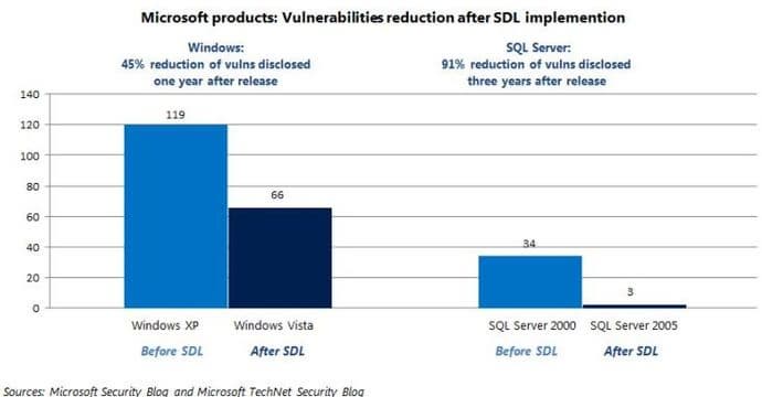 Все вместе это позволило добиться существенного снижения количества уязвимостей системы. Например, вот сравнение XP и Vista (в которой анализ стали проводить сразу при разработке) по количеству уязвимостей, выявленных в период первоначального распространения системы на рынке.