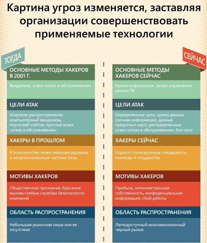 Соответственно, совершенно по-другому выглядела картина деятельности злоумышленников. Тогда это было некое сообщество бунтарей, а основной мотивацией атак был либо вандализм, либо желание отдельных личностей прославиться. Массовых атак и корыстных действий практически не существовало. Да и инструменты взлома и атаки тоже были относительно простые. То ли дело сейчас!