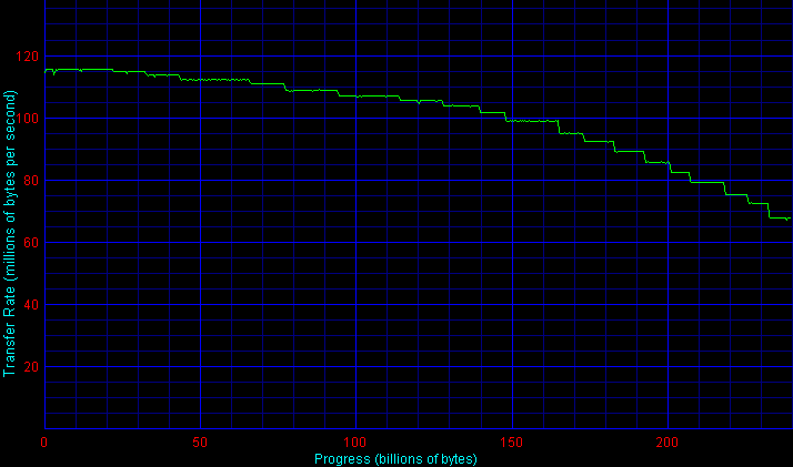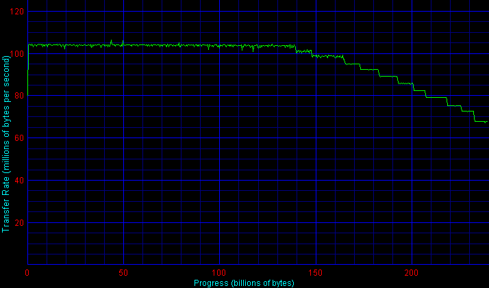 Если для контроллера 3ware Escalade 8500 (как и для Silicon Image SiI3114) графики скорости линейного чтения массивов RAID 10 (из четырех дисков WD1200SD) и RAID 5 из трех таких дисков практически равны «удвоенному» (по обеим осям) графику для одиночного диска WD1200SD, причем в данном случае для контроллера 3ware Escalade 8500 на «медленной» шине PCI не видно следов ограничения скорости массива из-за недостаточно высокой полосы пропускания шины PCI (сравните графики для PCI32 и PCI64), то для контроллера Adaptec 2410SA все исследованные массивы оказались «обрезанным» сверху по скорости примерно на уровне 100-105 Мбайт/с, то есть «недобрали» как минимум около 10% скорости в начале диска, а при размере блока чередования 64 Кбайт скорость упала еще ниже — до 85 Мбайт/с! В результате, четырехдисковый RAID 5 на AAR-2410SA оказался явно вне своей категории по скорости линейного чтения в начале и середине массива.