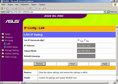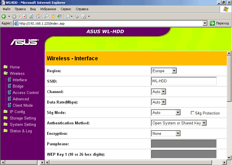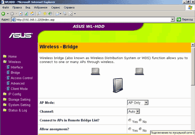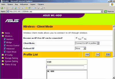 WL-HDD 2.5 способен выступать как в роли сетевого диска, будучи подключенным к уже существующей беспроводной сетевой инфраструктуре, так и в качестве точки доступа, естественно, сохраняя при этом свои функции хранилища данных. В последнем случае он должен быть тем или иным способом подключен к проводному сегменту. Настройки, относящиеся к выбору одного из двух этих режимов работы, содержатся в меню Wireless-Client Mode.