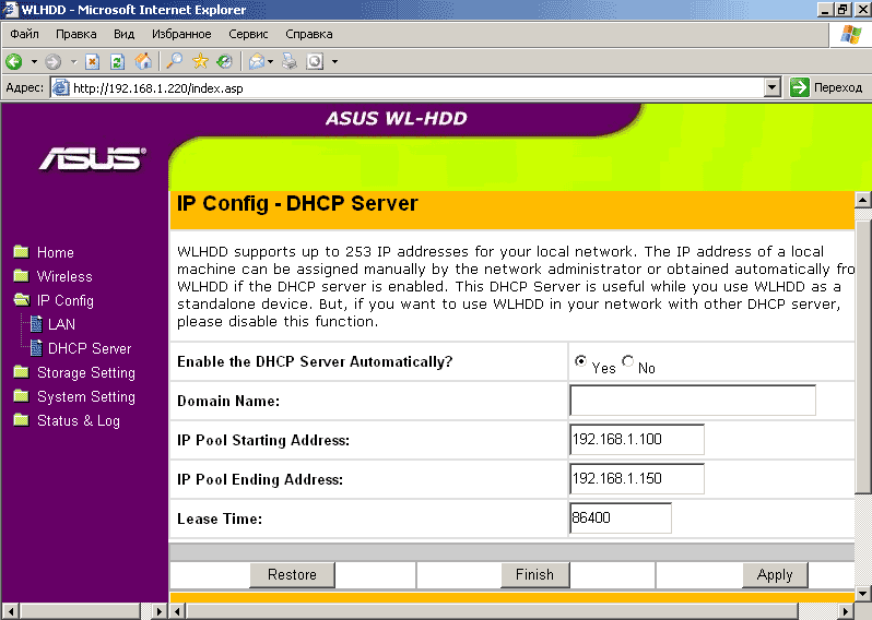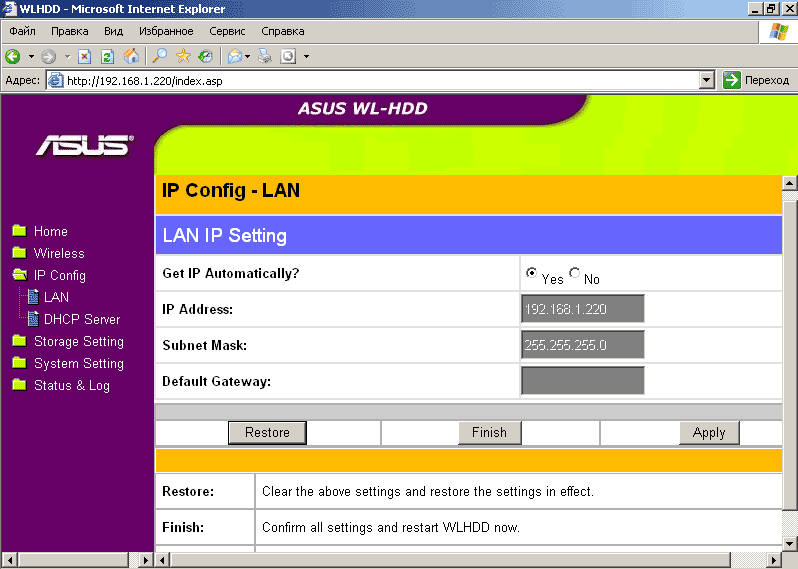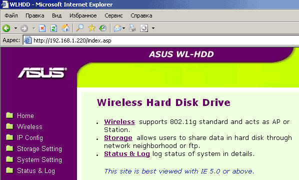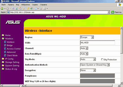 WL-HDD2.5 беспроводным образом wireless-роутеру ASUS WL-500G Deluxe (поддерживающему 802.11g), который кабелем был соединен с Ethernet-контроллером материнской платы;
