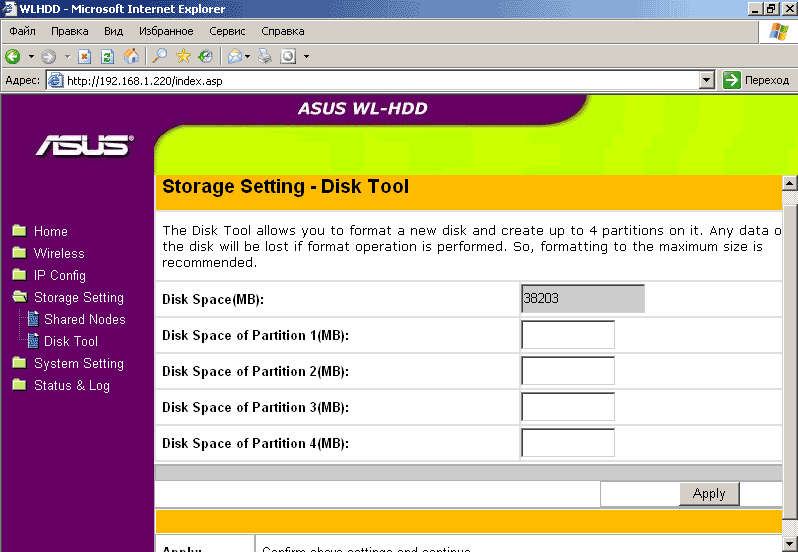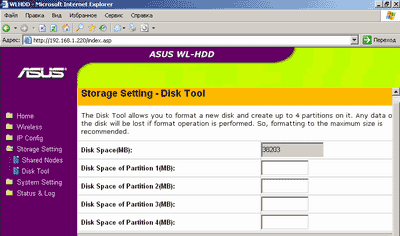 В спецификациях заявлено, что с дисками объемом более 40 Гбайт кейс ASUS WL-HDD2.5 не дружит. Однако на поверку оказалось, что все не так плохо — 100-гигабайтный Seagate Momentus 54.2, предварительно отформатированный на весь объем под FAT32, без проблем заработал в этом кейсе на свой полный объем. Ограничения начались лишь тогда, когда этот диск захотелось разбить/отформатировать утилитой через сеть — здесь Storage Setting — Disk Tool позволила создать логические диски объемом не более 40 Гбайт (с EXT2), хотя на 100-гигабайтном диске таких логических дисков (разделов) удалось сделать несколько, фактически задействовав полный физический объем накопителя.
