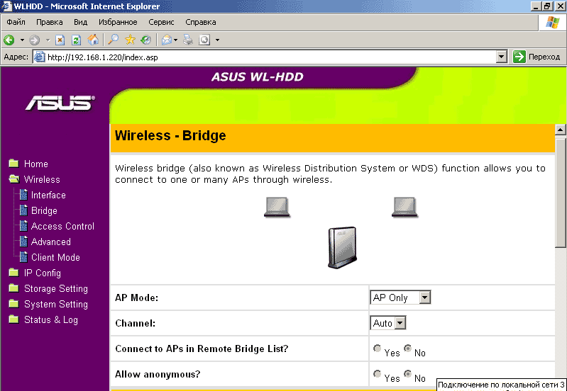 Меню Wireless-Bridge содержит настройки, относящиеся к использованию WL-HDD2.5 в качестве беспроводного моста.