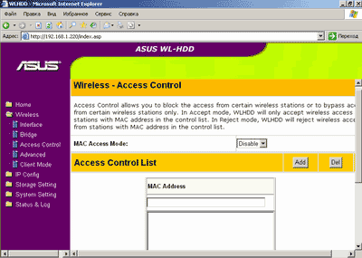 Меню Wireless-Access Control позволяет настроить беспроводной доступ по контрольному списку MAC-адресов.