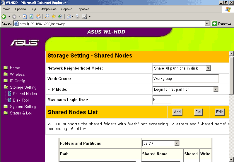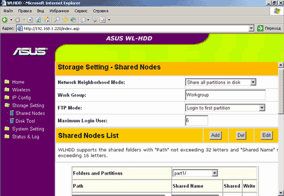 Меню Storage Setting — Shared Nodes позволяет настроить и разграничить права доступа пользователей к разделам жесткого диска и отдельным папкам, изменить рабочую группу, определить максимально возможное число одновременно подключенных пользователей.