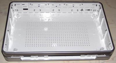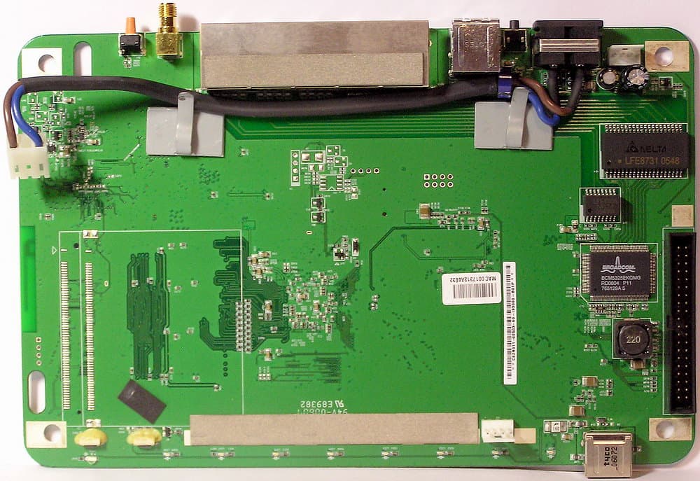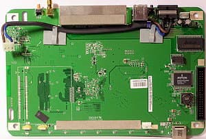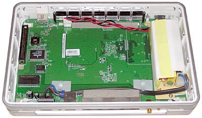 Под «саркофагом» на дне литого основания из белого пластика установлены основная плата электроники роутера со всеми разъемами, органами управления и индикации (свечение светодиодов на плате выводится на переднюю панель корпуса роутера линейкой протяженных оргстеклянных световодов),