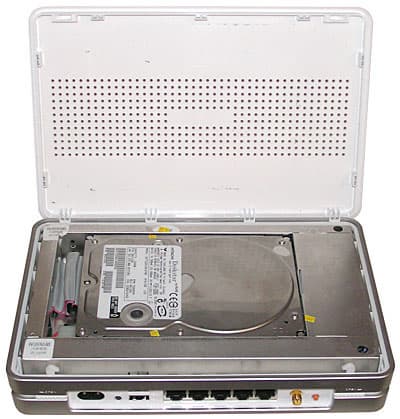 Под крышкой обнаруживается винчестер, заключенный в тонкий и проветриваемый жестяной «саркофаг». Модель диска — Hitachi HDT722516DLAT80 емкостью 160 Гбайт, впрочем, об этом мы отдельно поговорим во второй части нашего обзора.