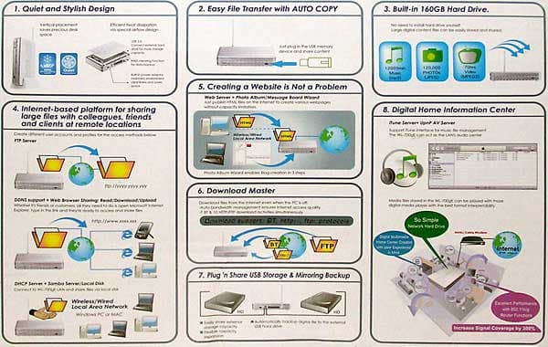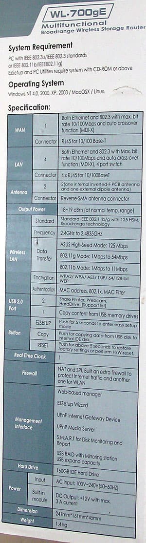 Однако у ASUS WL-700gE имеется то, что приподнимает его над собратьями по цеху — USB-порты и встроенный винчестер! И соответственно связанные с этим функции — возможность совместного использования дискового пространства, зеркалирование хранящихся на встроенном винчестере данных, автономная закачка файлов из Интернета и много еще чего, что мы рассмотрим подробнее во второй части обзора.