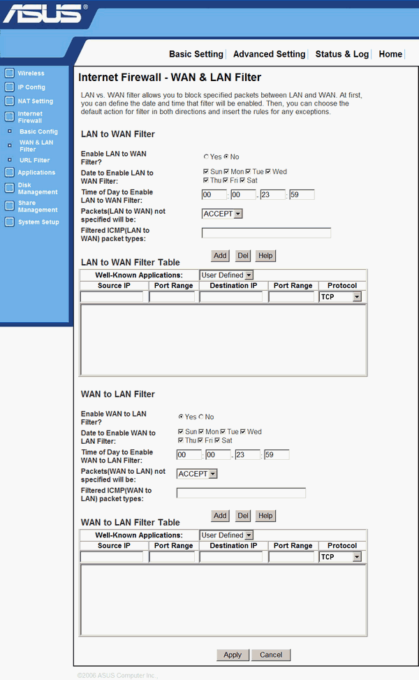 Как было отражено в таблице 1, файрвол устройства позволяет осуществлять фильтрацию как входящего, так и исходящего трафика, однако широкими возможности настройки никак не назовёшь — фильтрация только по диапазону портов и адресам; одна таблица расписания на входящие фильтры и одна — на исходящие.