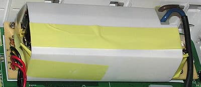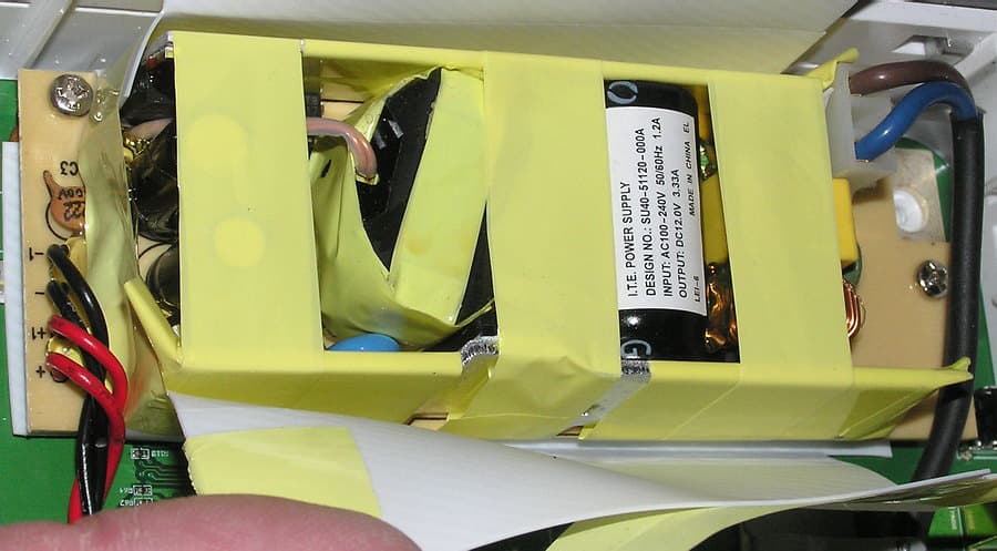 Блок питания обернут (заизолирован) гибким пластиком. Такая конструкция, в принципе, делает возможной и несложной замену встроенного блока питания подходящим с рынка — в случае выхода первого из строя.