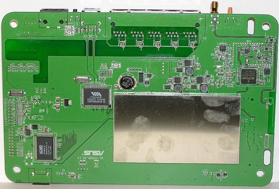 Печатная плата роутера с двухсторонним монтажом несет на себе все необходимые контроллеры, разъемы и органы управления/индикации.