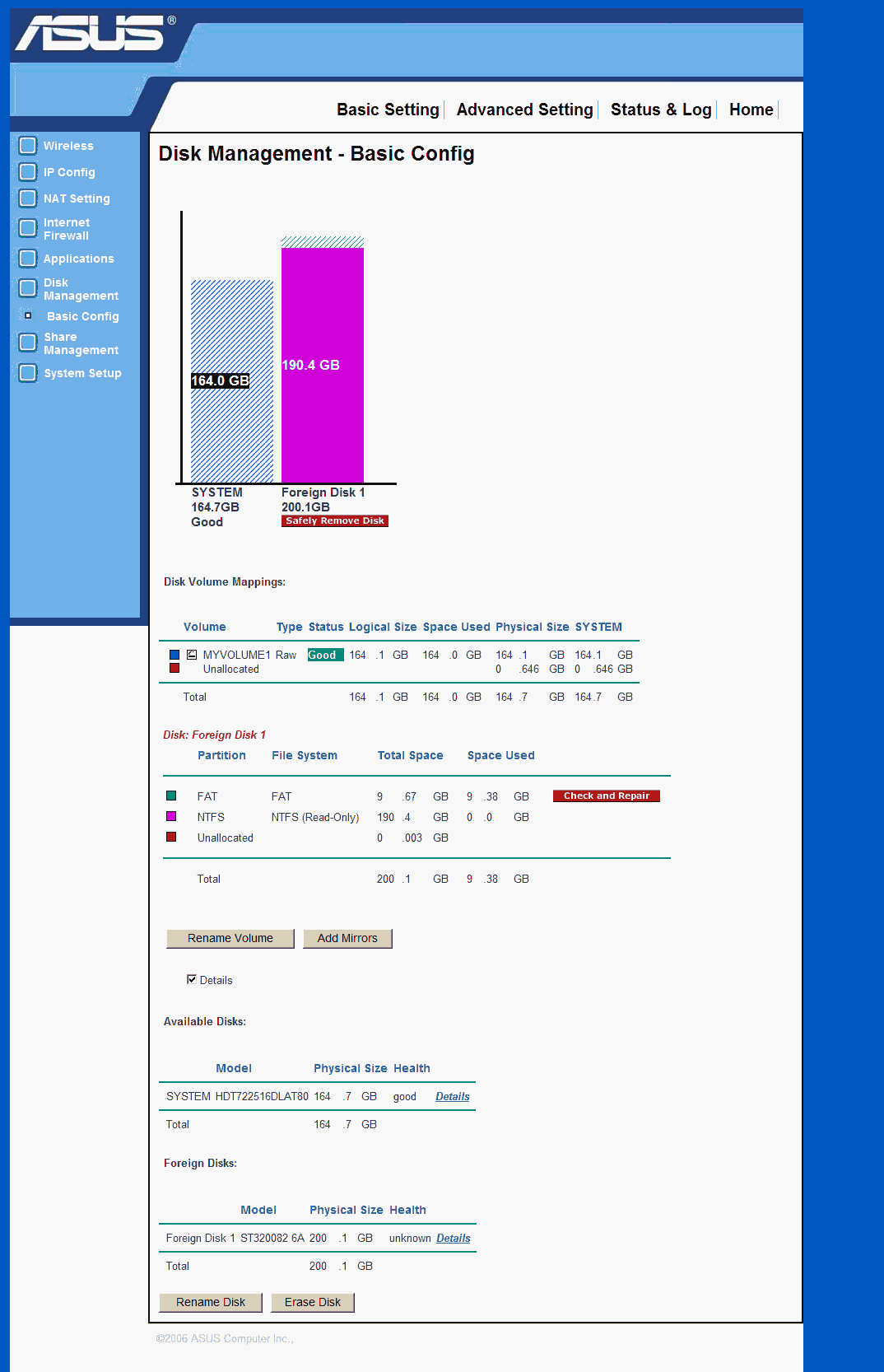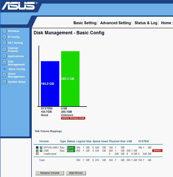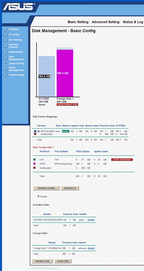Была замечена и некоторая капризность WL-700gE в работе — он отказался работать с переносным 2,5″ винчестером в USB-корпусе Vosonic VP3320, упорно определяя его как Broken Disk.