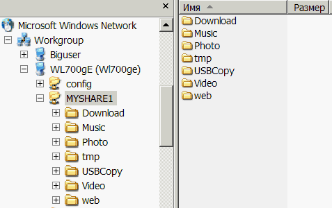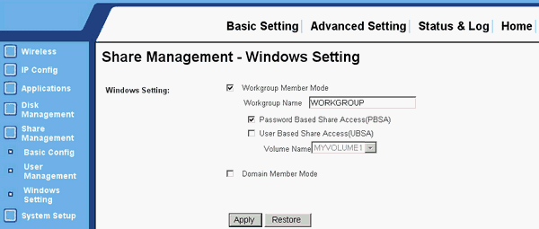 В целом интерфейс для расшаривания достаточно удобный и продуманный: запросто поселяем WL-700gE в рабочую группу или домен, настраиваем парольный или пользовательский режим доступа,