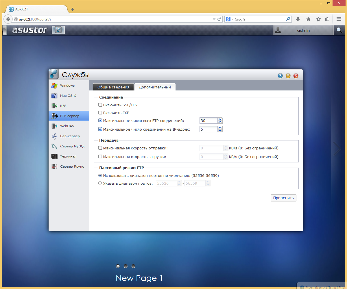 Список поддерживаемых устройством протоколов включает в себя CIFS/SAMBA, AFP, NFS, FTP, WebDAV. Сервера FTP поддерживает Unicode, SSL/TLS, FXP и пассивный режим. В настройках можно изменить номера его портов и ограничить число подключений и скорости приема и передачи.
