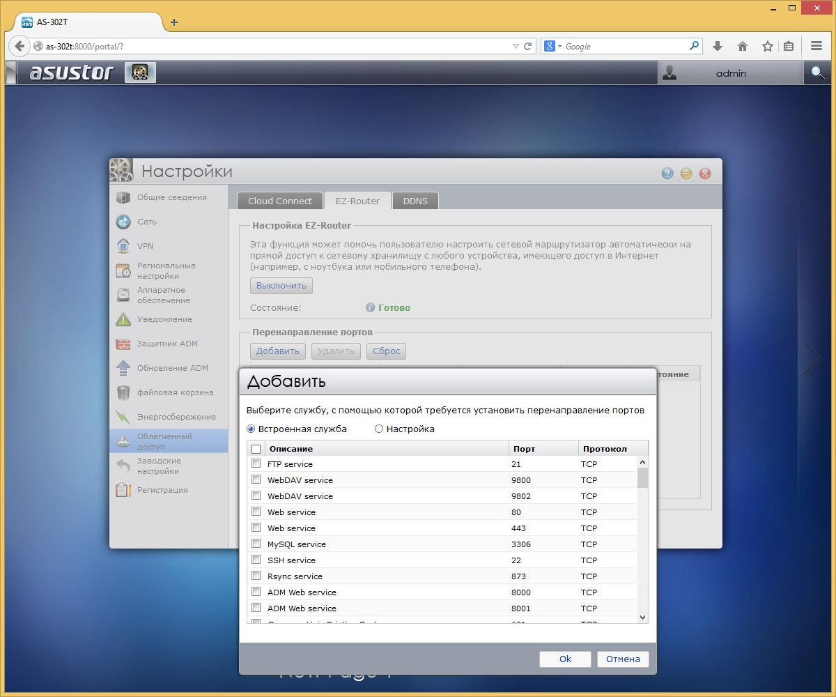 Для упрощения удаленного доступа к накопителю через Интернет предусмотрено несколько функций. Клиент DDNS позволит вам получить постоянное имя при динамическом IP-адресе. Сервис EZ-Router настроит роутер по протоколу UPnP для трансляции портов требуемых сервисов. Cloud Connect предназначен для работы с фирменными утилитами Asustor по назначаемому идентификатору устройства, а не IP-адресу. К сожалению, в реальной работе данная функция оказалась не очень стабильной.