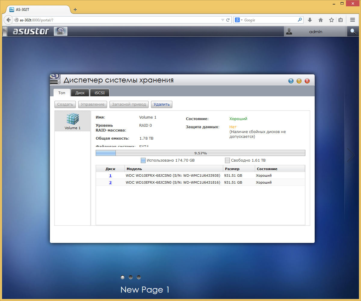 Для настройки дисковых массивов и томов iSCSI используется «Диспетчер системы хранения». Накопитель поддерживает организацию винчестеров в различные варианты RAID, а также работу с одиночными дисками. Предусмотрены функции расширения дискового пространства и миграции томов без потери данных.