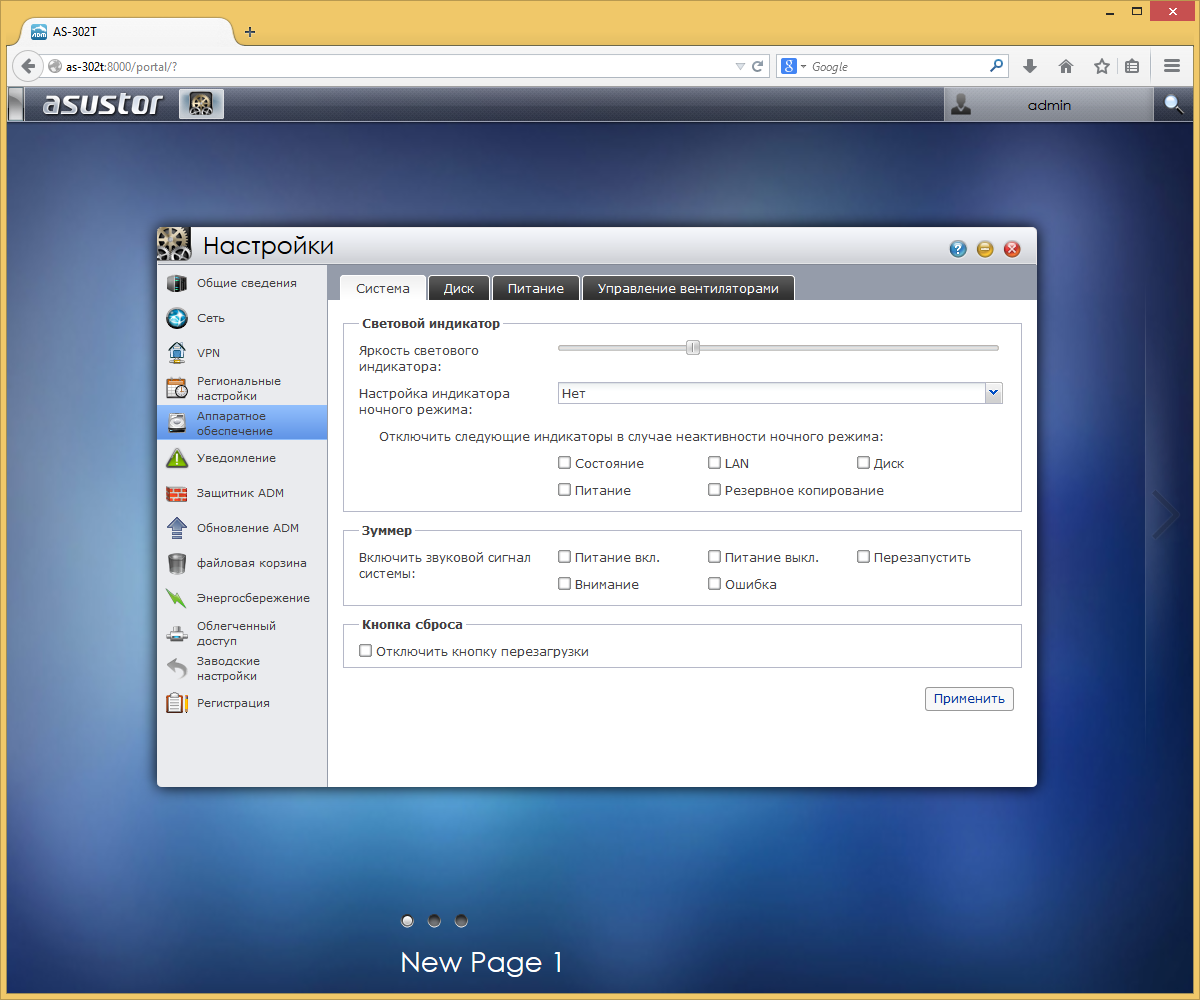 В разделе аппаратных параметров предусмотрена регулировка яркости и отключение светодиодных индикаторов, настройка звуковых сигналов, блокировка кнопки сброса настроек, выбор скорости работы вентилятора. Что касается управления питанием, то накопитель поддерживает спящий режим внутренних и внешних винчестеров, включение по сети и программирование расписания работы.