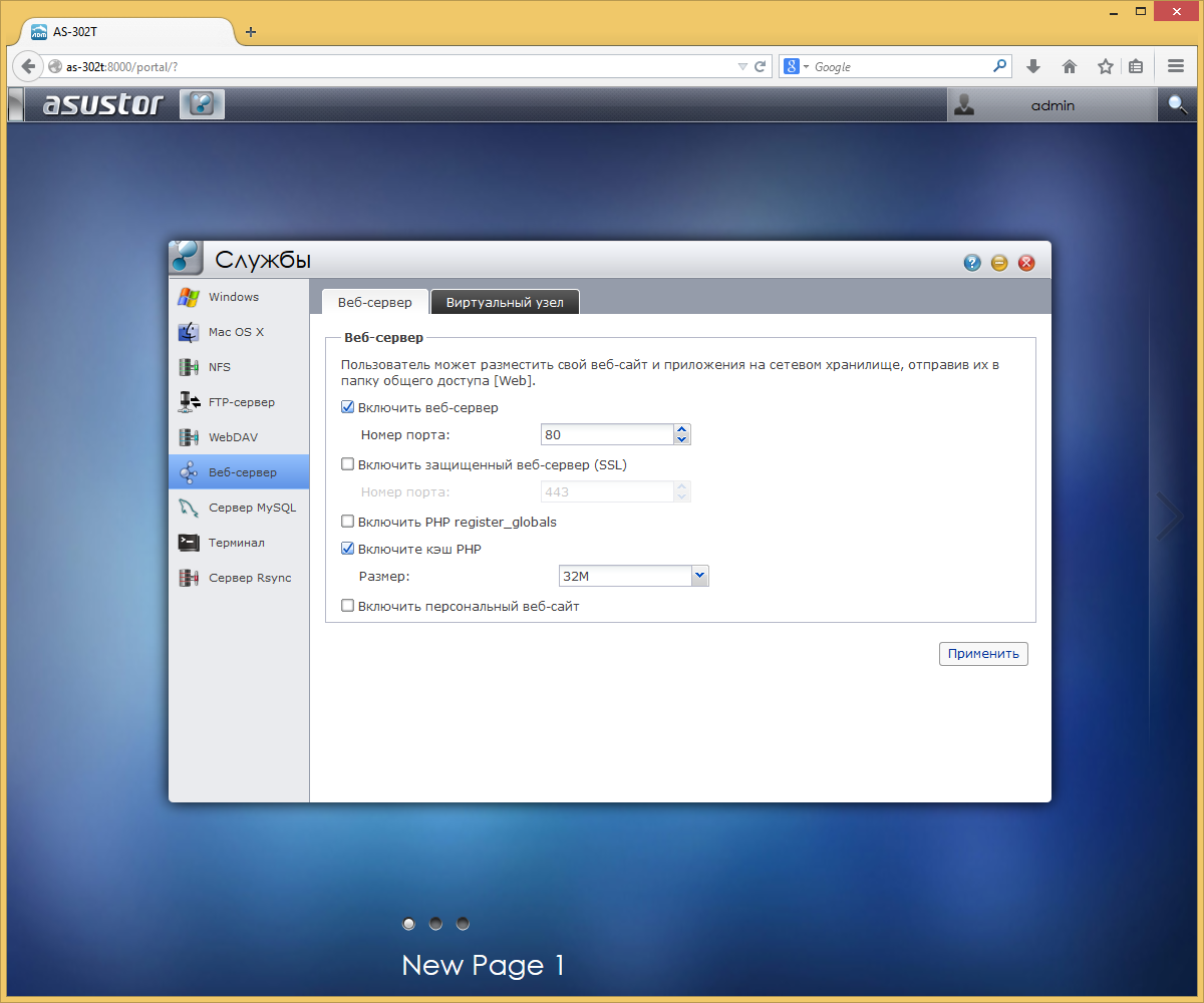 Список возможных вариантов включает в себя: собственный интерфейс ADM, браузер Google Chrome, медиаоболочку XBMC, просмотр живой картинки и записей станции видеонаблюдения, эмулятор игровых приставок SNES9X. В настройках сервиса Asustor Portal выбирается приложение по умолчанию, фоновая картинка, разрешение видеовыхода, экранная заставка и другие параметры.