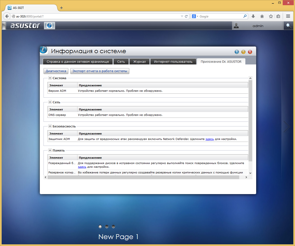 В разделе «Информация о системе» приводятся основные данные о сетевом накопителе, включая версию прошивки, время работы, сетевые адреса, аппаратные характеристики (включая температуру процессора и скорость вентилятора). Здесь же находится журнал событий системы. При этом можно активировать регистрацию операций по различным сетевым протоколам, например FTP или SSH. Отдельно стоит упомянуть функцию Dr. Asustor, которая может помочь в решении проблем с устройством, а также дать рекомендации по настройке накопителя.