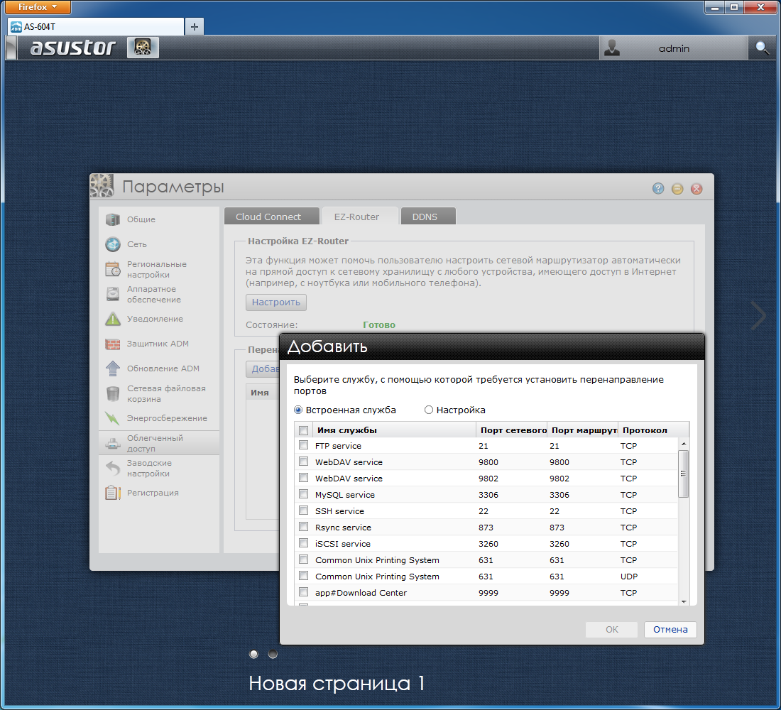 Поддерживается использование UPnP-совместимых роутеров для интернет-публикации сервисов устройства. Еще больше упрощает задачу функция Cloud Connect, которая является аналогом DDNS в домене myasustor.com, требующей только придумать уникальное имя.