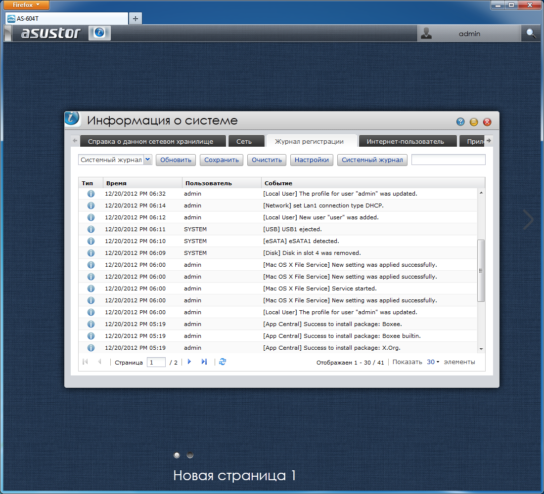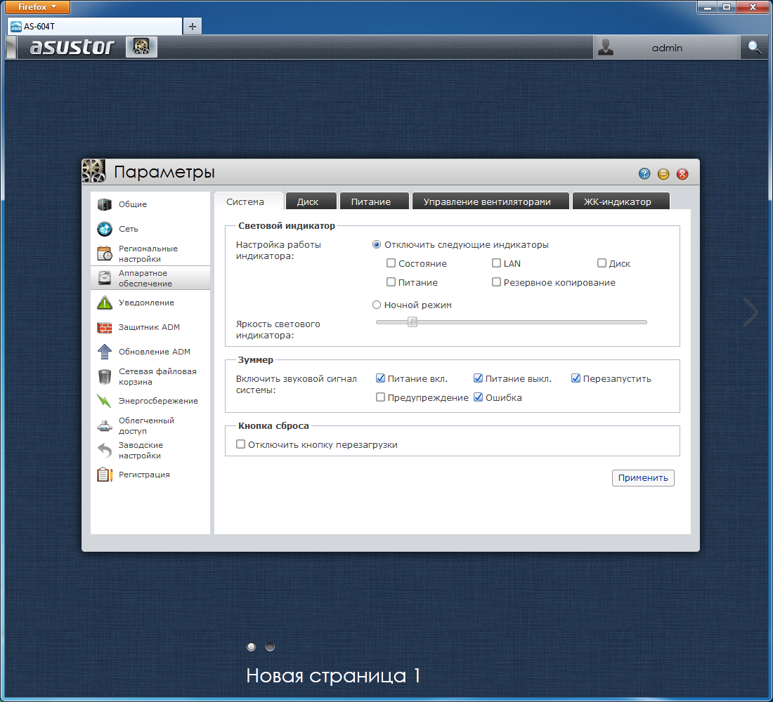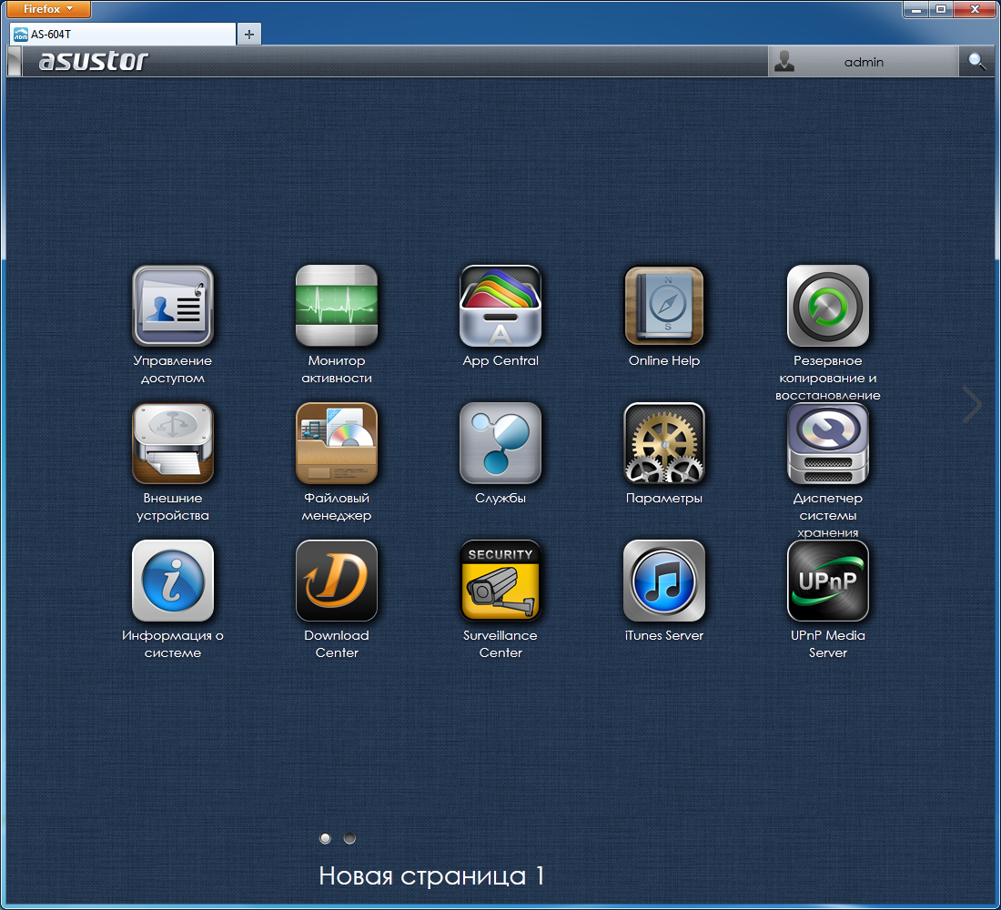 После инициализации можно воспользоваться полной версией web-интерфейса для управления системой и ее работой. После входа администратора, устройство проверяет доступность новой версии прошивки, при ее наличии загрузка и установка могут проходить в автоматическом режиме. В случае отсутствия на NAS доступа к интернету, можно установить обновление обычным способом из скачанного с сайта производителя файла.