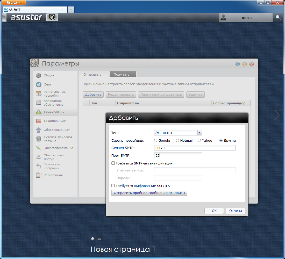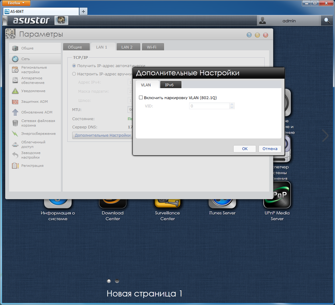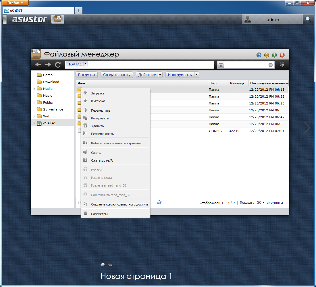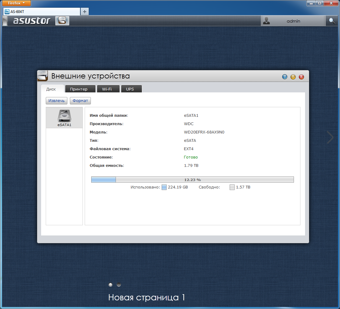 После инициализации можно воспользоваться полной версией web-интерфейса для управления системой и ее работой. После входа администратора, устройство проверяет доступность новой версии прошивки, при ее наличии загрузка и установка могут проходить в автоматическом режиме. В случае отсутствия на NAS доступа к интернету, можно установить обновление обычным способом из скачанного с сайта производителя файла.