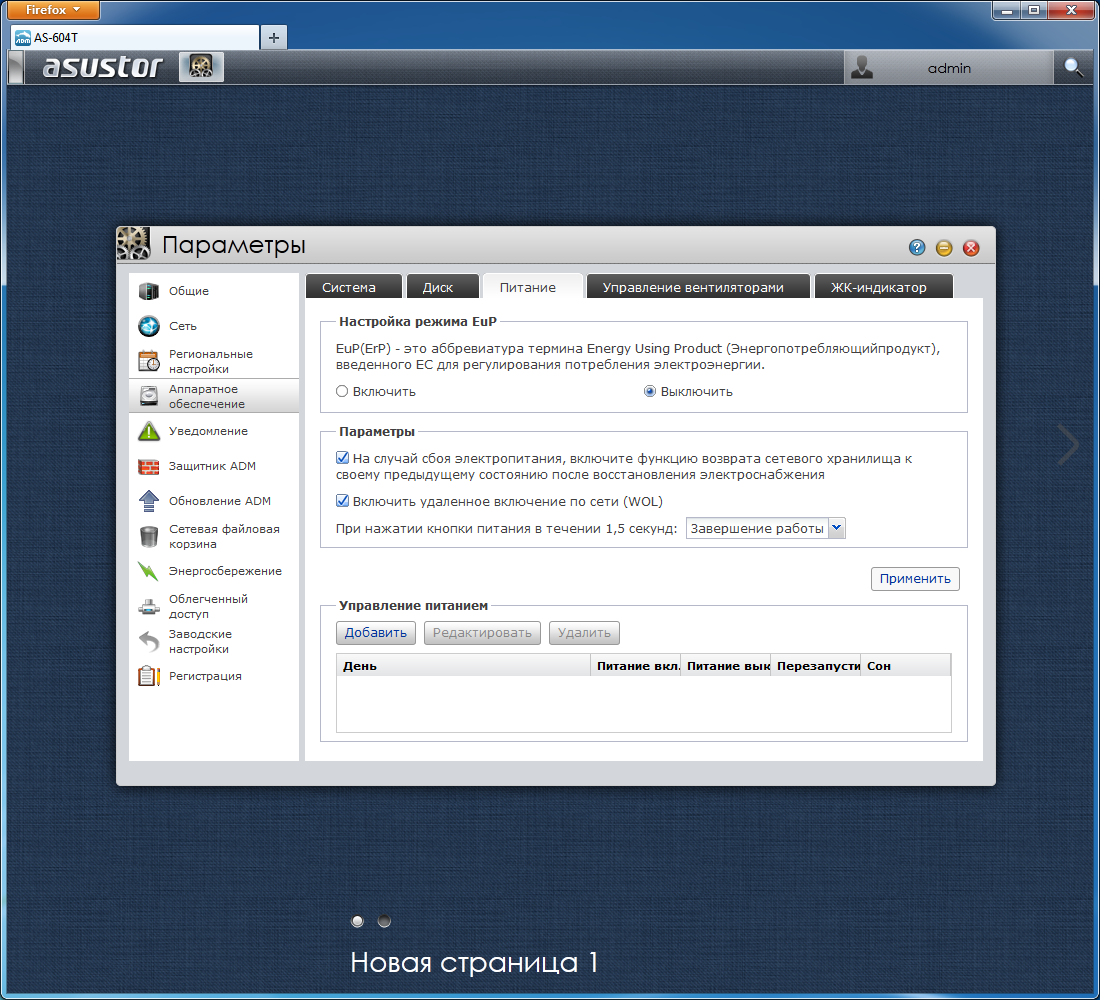 Как и другие устройства на базе Intel Atom, данная модель имеет расширенные возможности управления питанием — поддерживает WOL, умеет включаться после аварийного выключения, позволяет установить расписание работы. Причем в расписании кроме «включить» и «включить» можно указывать действия «сон» и «перезагрузка».