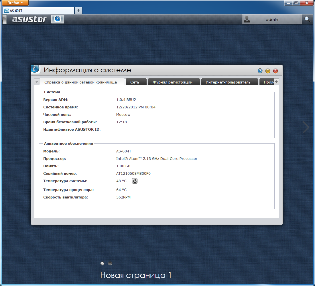 На двух страницах раздела «Информация о системе» можно получить основные данные о статусе накопителя — название, модель, тип процессора, объем оперативной памяти, скорость вентилятора, температура системы и процессора, серийный номер, сетевые настройки, идентификатор Asustor ID.