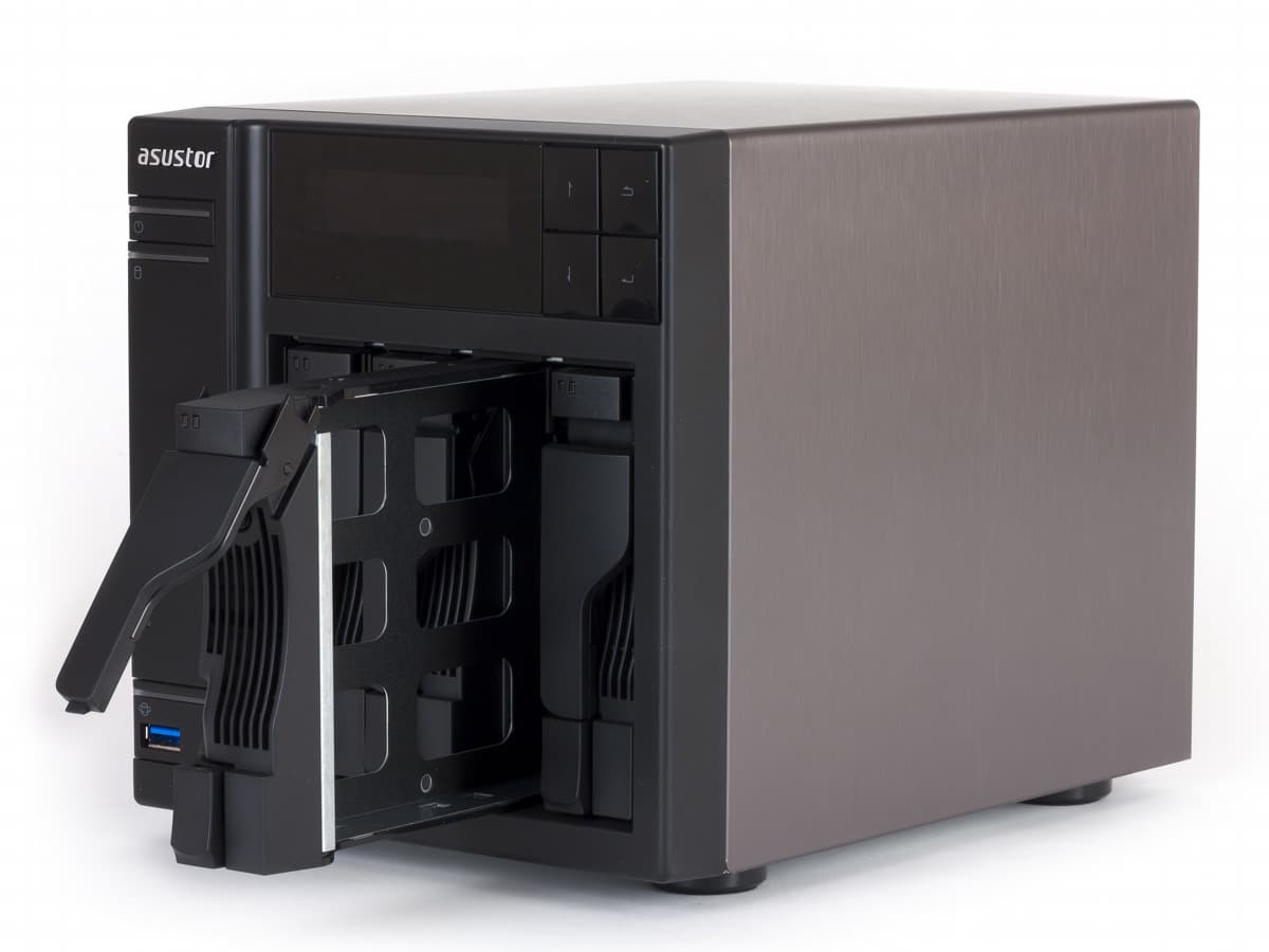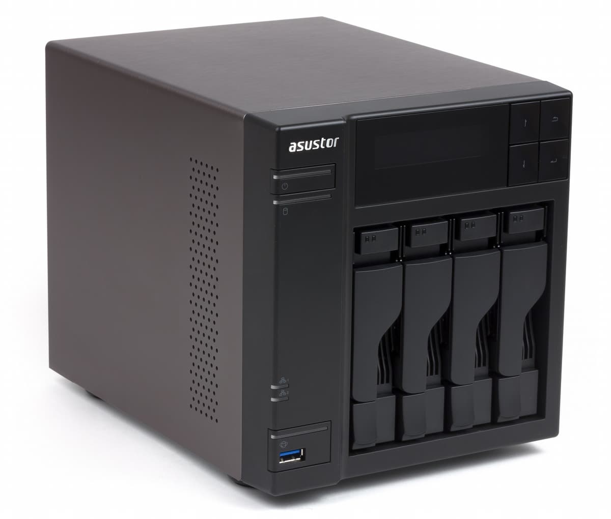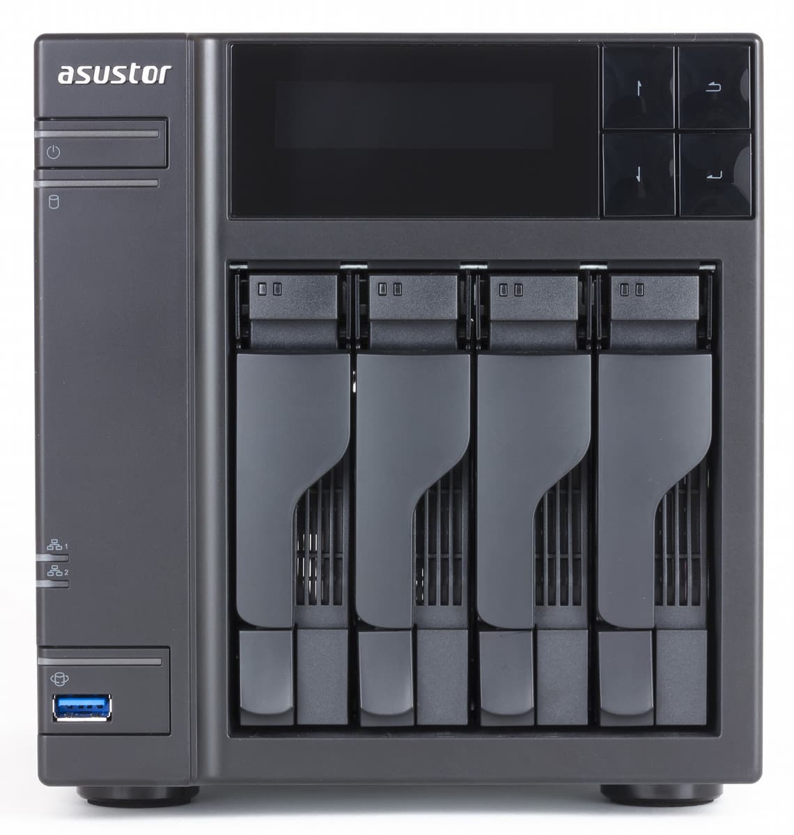 По аппаратной платформе они отличаются мало и имеют одинаковые процессоры семейства Intel Atom, объем оперативной памяти и порты ввода-вывода. Разницу можно заметить только в корпусах, размере вентилятора и отсутствии у младшего устройства дисплея и кнопок. Так что большинство из описанного в данном материале можно будет отнести ко всем устройствам сразу. А конкретно тестироваться будет четырехдисковая модель AS-604T, рассчитанная на сегмент SOHO/SMB. Посмотрим, насколько это устройство соответствует заявленному статусу производителя.