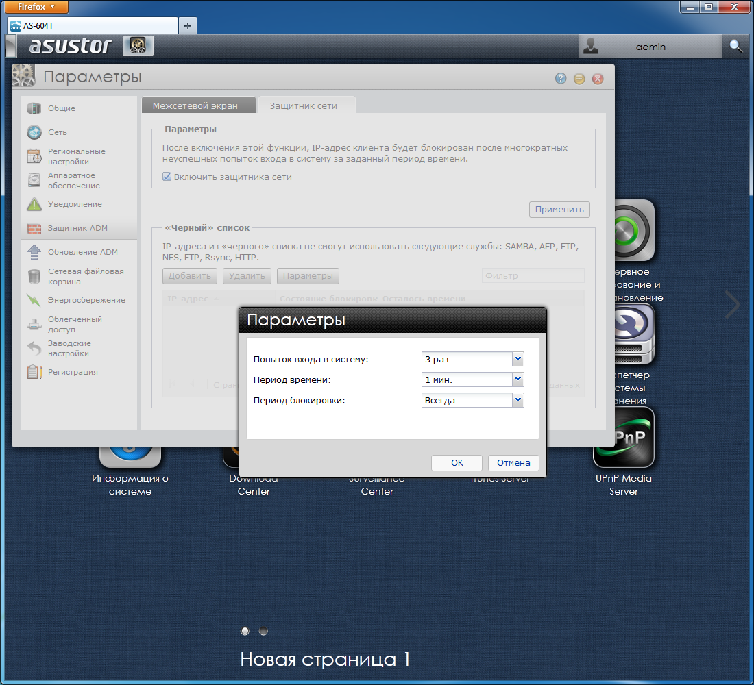 Дополнительно повысить безопасность сетевых коммуникаций можно с использованием «Защитника ADM», представляющего собой межсетевой экран с программируемыми правилами. Не обошлось и без известной по другим моделям функции блокировки доступа при обнаружении попытки подбора паролей к сервисам SMB, AFP, FTP, NFS, FTP, Rsync и HTTP.