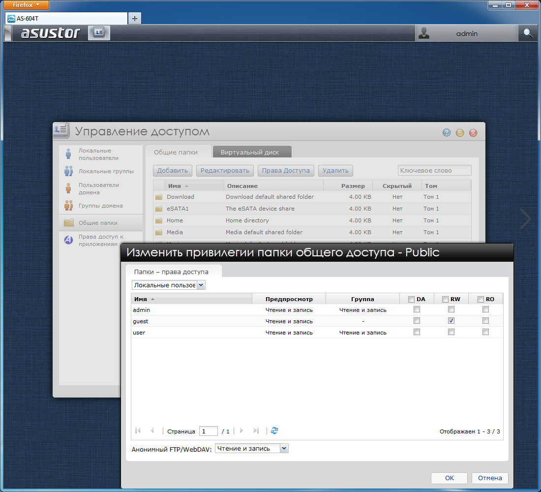 Для обычных директорий используется традиционная схема с пользователями и группами, позволяющая назначить один из вариантов — нет доступа, только чтение, чтение и запись. При этом устройство может работать с собственной базой или использовать информацию из домена Windows. Отметим, что установка дисковых квот возможна на уровне пользователей, но не групп. Права выдаются не только на данные, но и использование дополнительных сервисов, таких как система загрузки файлов, видеонаблюдение и т. п.