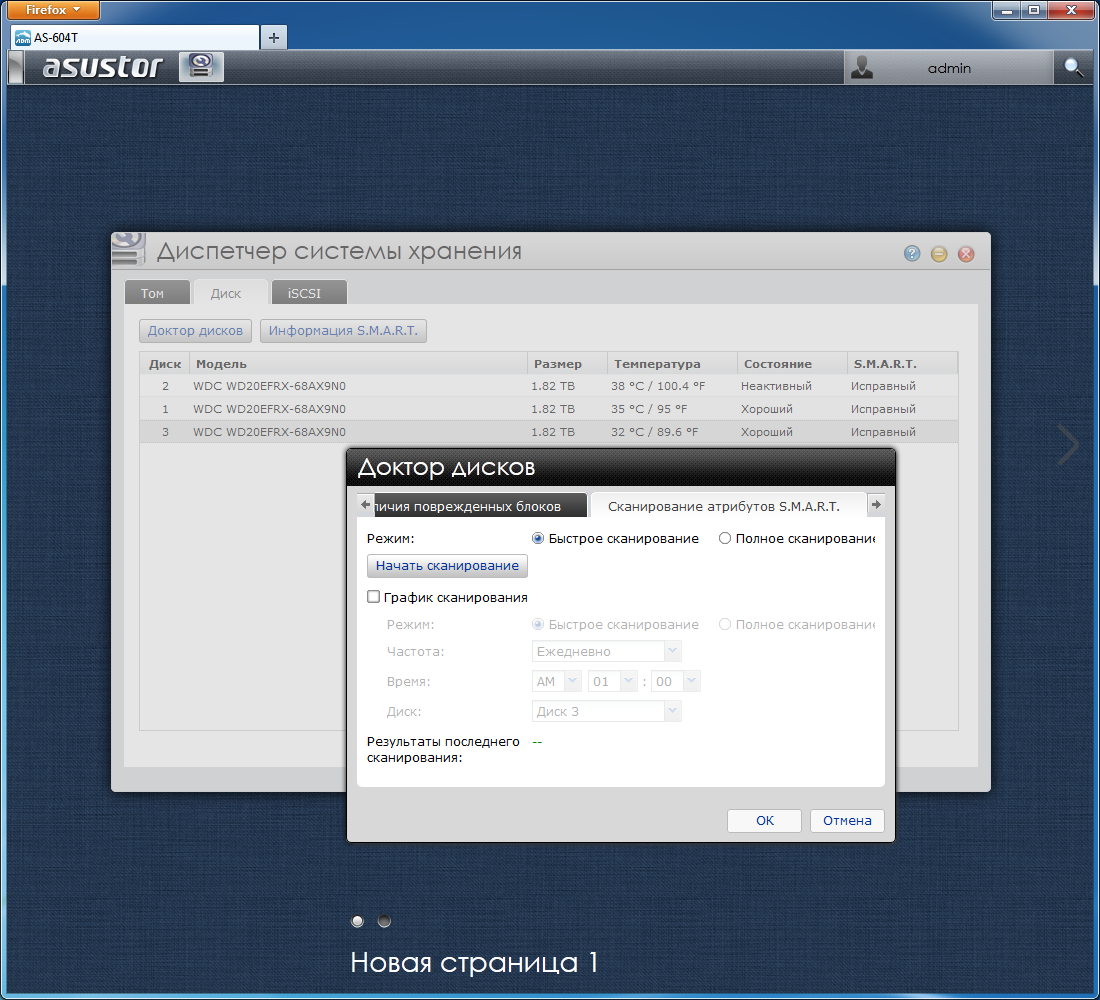 Для управления дисками и томами используется приложение «Диспетчер системы хранения». Для винчестеров можно посмотреть название модели, объем, температуру, статус S.M.A.R.T. Также предусмотрен запуск по расписанию тестов S.M.A.R.T. и полного сканирования поверхности. Диски (внутренние и внешние) могут выключаться при отсутствии активности. Интервал задается администратором.