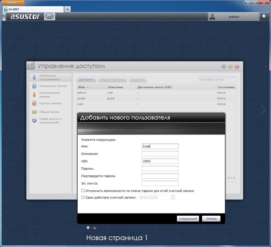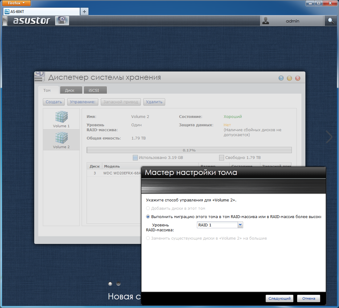 Поскольку образ операционной системы записан на встроенном флэш-накопителе, никаких дополнительных программ использовать не нужно. В процессе инициализации через браузер пользователь указывает несколько основных параметров — имя устройства, пароль администратора, настройки даты и времени, сетевые опции, тип и участников дискового массива.