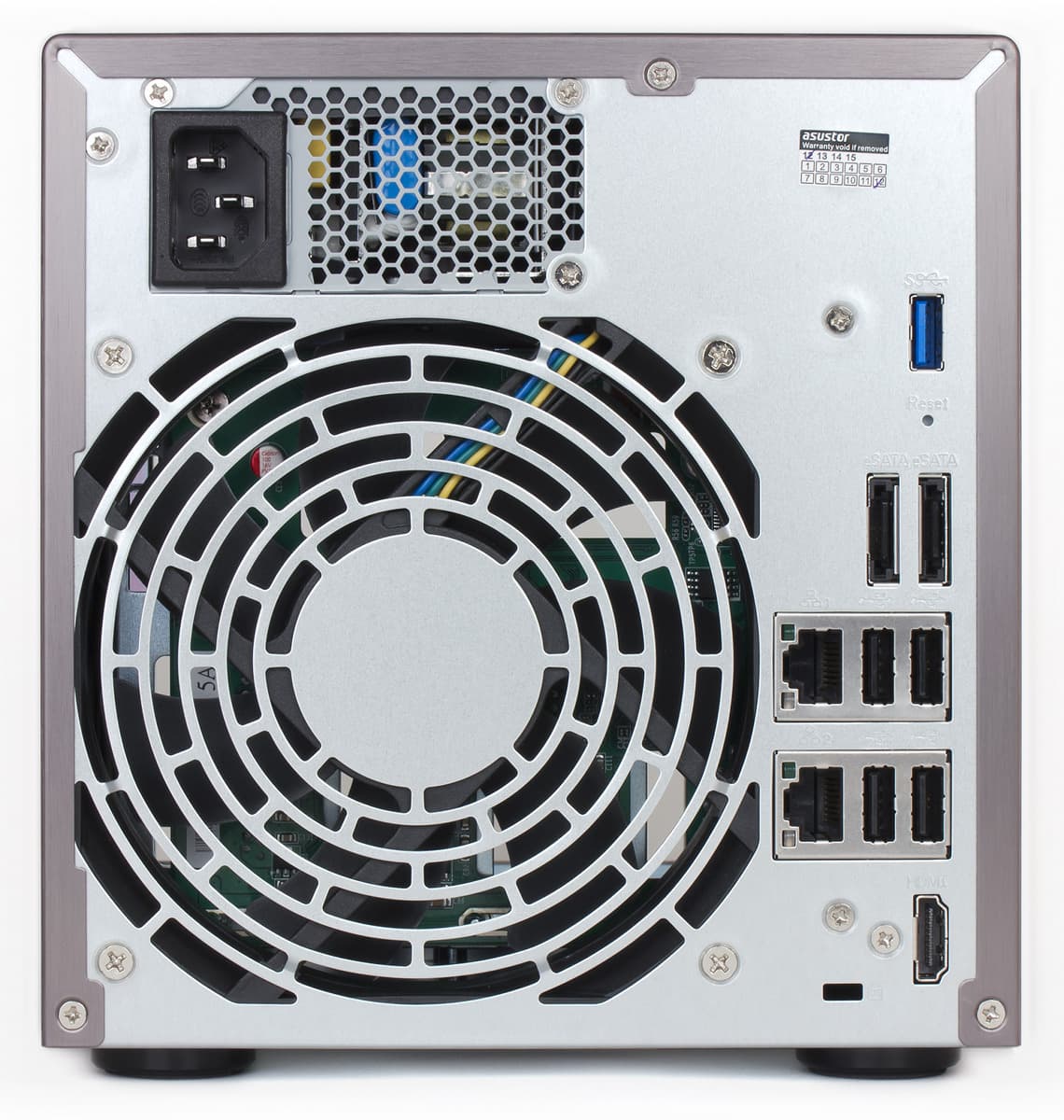 При взгляде на заднюю панель прежде всего замечаешь решетку огромного вентилятора. Он соответствует моделям 120 мм и использует четырехконтактный разъем для подключения. В верхней части находится вход блока питания. Отметим, в нем есть компактный вентилятор, но его просто не видно снаружи. В правой части расположены все интерфейсные разъемы накопителя: один USB 3.0, два eSATA, четыре USB 2.0, две гигабитные сети, HDMI. Также есть скрытая кнопка сброса настроек и отверстие кенсингтонского замка . Опирается устройство на небольшие ножки с резиновым основанием.