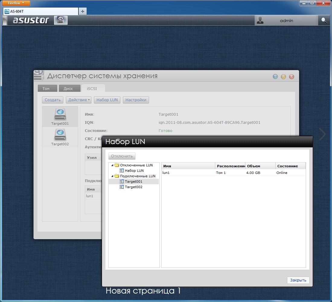 Работа с iSCSI обеспечивается на файловом уровне. В накопителе можно создать несколько таргетов и несколько LUN, а позже настраивать их соответствия. Поддерживаются контрольные суммы, аутентификация, thin provisioning.