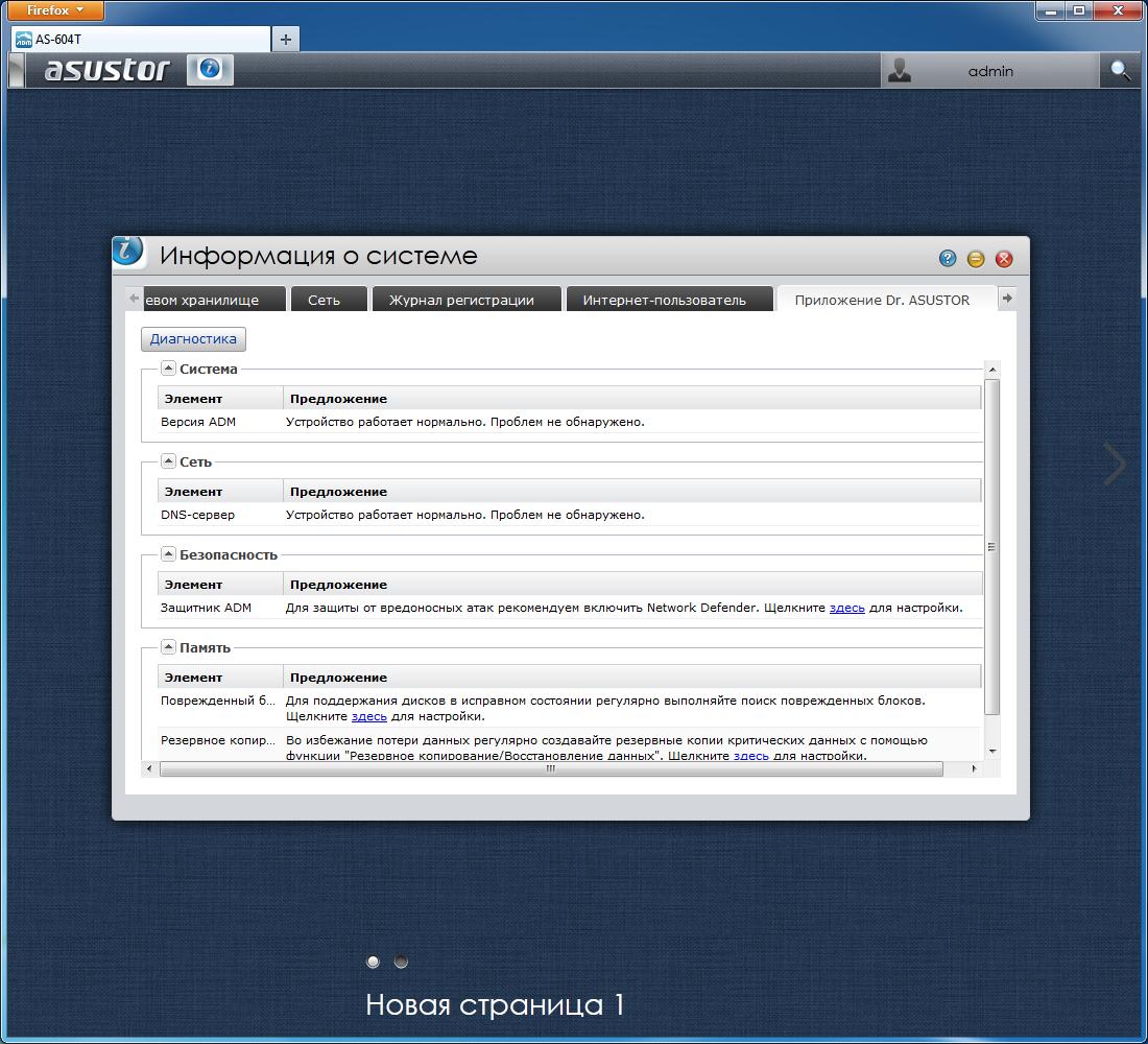 Для диагностики работы устройства может использоваться функция «Dr. Asustor». Она проверяет основные параметры и дает рекомендации и советы по исправлению проблем и улучшению работы.